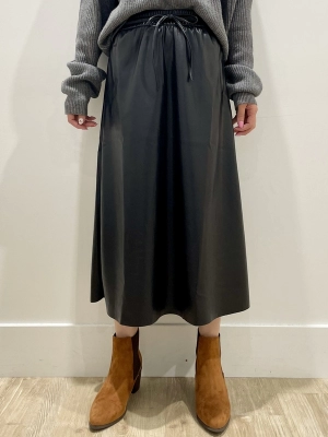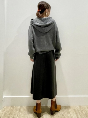 フェイクレザースカートに、ふんわり柔らかな雰囲気のニットパーカーをあわせて大人カジュアルコーデに。