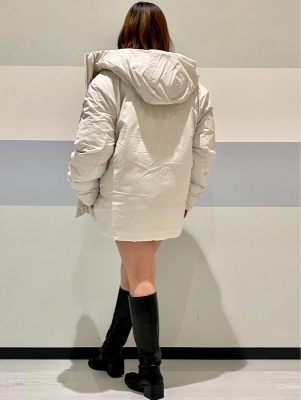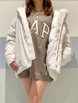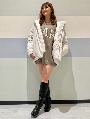 羽織っているアウターは、ユニセックスアイテムのパファージャケット。