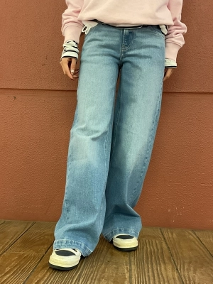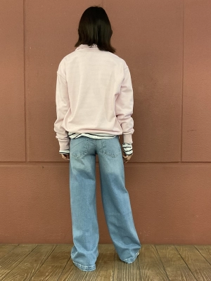 パステルピンクの優しい色を綺麗な水色のデニムに合わせた可愛いコーディネート。
