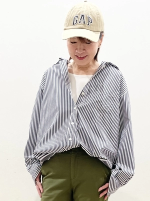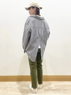 背中の開いたところから、覗かせる白Tはビッグシャツに合わせて大きめに。