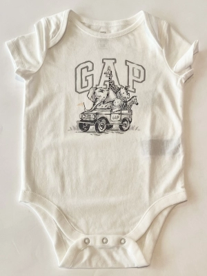 ジープにブラナンくん、ゾウ、キリン、サイ、シマウマが一緒に乗っている絵が可愛いボディシャツ♡ゾウが鼻で持っている旗に色がついているのもポイント♪