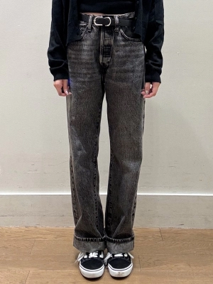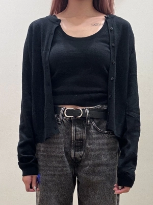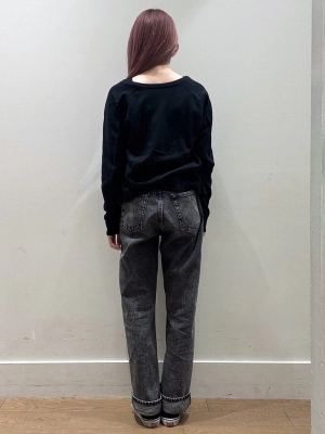 薄手のカーディガンは丈が腰のあたりでどんなボトムスでも合わせやすく重宝しそうです。タンクトップは同素材で丈は短いのでバランスよく着こなせます。デニムパンツはメンズのルーズタイプ。下はゆったりとしたシルエット、上は少しタイトめでバランスよく合わせました。