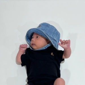 ロンパースにパンツを合わせてお出掛けスタイルに。