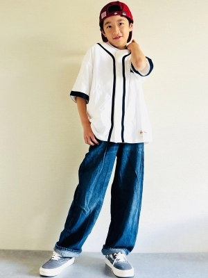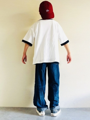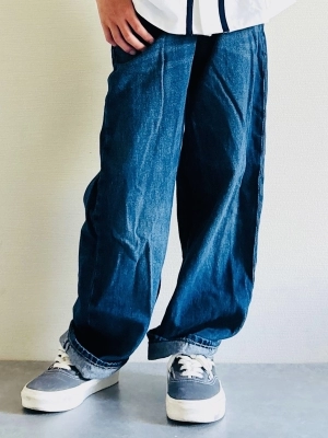 デニムバギーパンツは太めなので、トップスは140サイズをセレクトし、スッキリ着用しました。