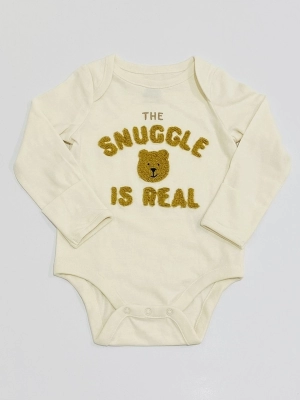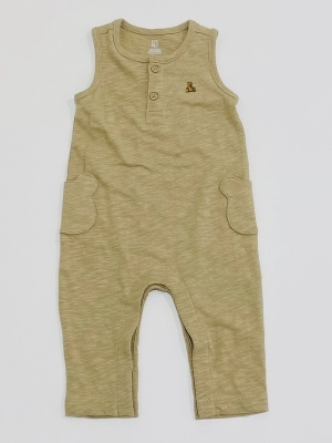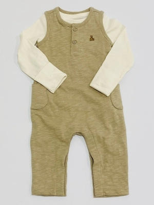 ベージュのカバーオールにワッペンボディスーツがキュートになります。